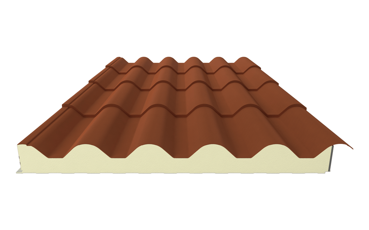 Panel cubierta Imitación Teja 30MM RAL 8004 en parte superior y blanco en parte interior, siempre servimos con film en ambos lados. Cobramos al corte, medida máxima 13300 mm.