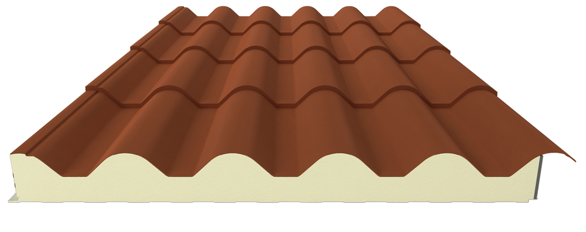 Panel cubierta Imitación Teja 30MM RAL 8004 en parte superior y blanco en parte interior, siempre servimos con film en ambos lados. Cobramos al corte, medida máxima 13300 mm.